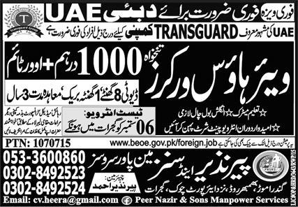 Peer Nazeer & Sons Manpower Services is looking for candidates for following posts as per job advertisement published in daily Express Newspaper of September 3, 2022 for location Abu Dhabi, dubai UAE: