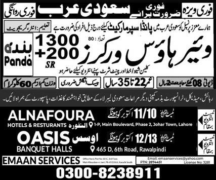 Emaan Services is looking for candidates for following posts as per job advertisement published in daily Express Newspaper of October 9, 2024 for location Jeddah, taif Saudi Arabia: