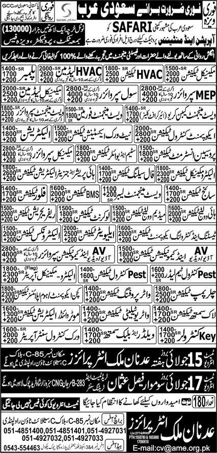 Faisal Usman Trade Test & Training Center invites applications for job positions advertised in daily Express dated 13 July 2023 for following vacancies in Riyadh, dammam Saudi Arabia.