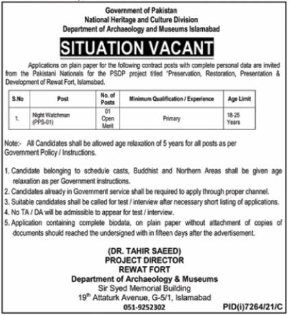 Department of Archaeology & Museums , National Heritage & Culture Division jobs advertisement dated about 18 April 2022 in daily Nawaiwaqt Newspaper invites application for the vacant post of night watchman and watchman in Islamabad, islamabad Islamabad Pakistan. Educational qualifications required Primary etc.