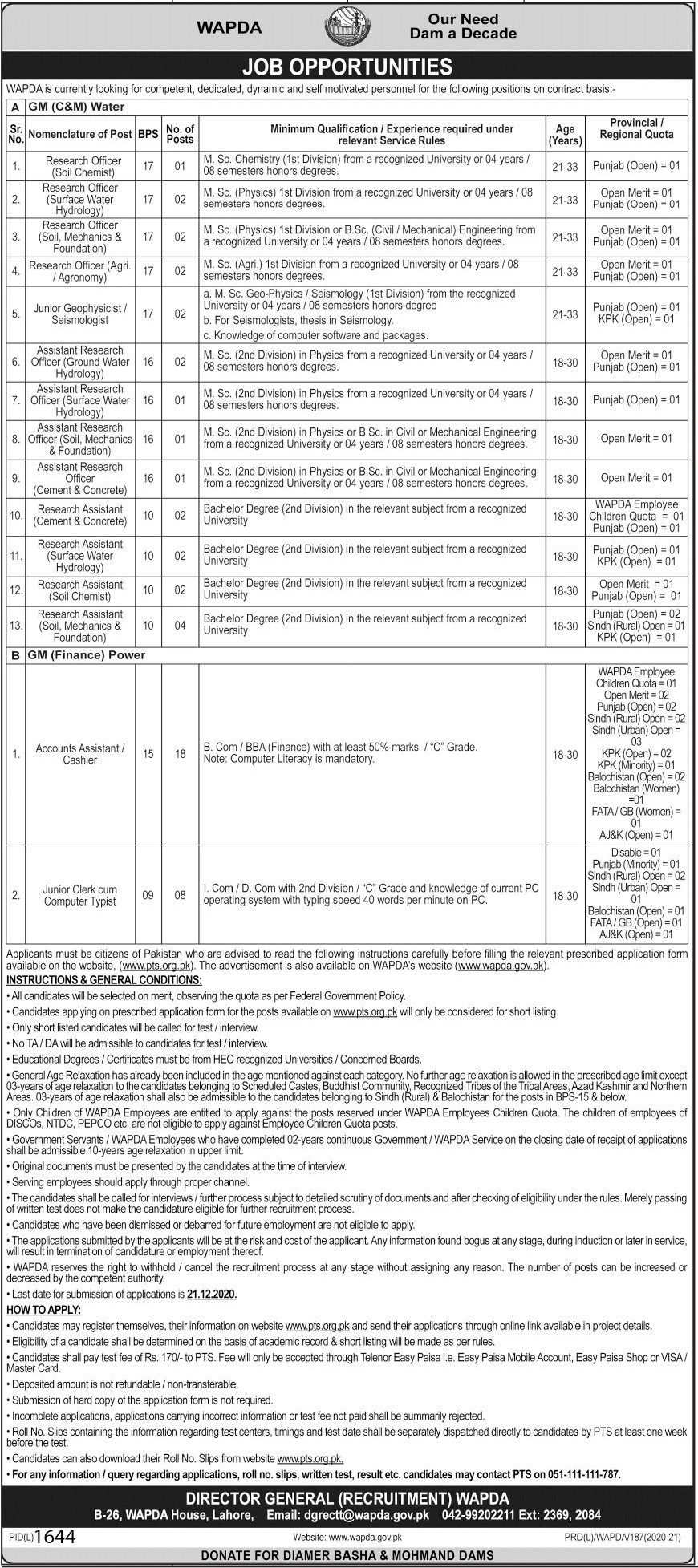 Water and Power Development Authority WAPDA is currently looking for competent and self motivated personnel for the posts of Research Officer Soil Chemist, Research Officer Surface Water Hydrology, Research Officer Soil Mechanic, Research Officer Foundation, Research Officer Agriculture, Research Officer Agronomy, Geophysicist, Seismologist, Assistant Research Officer Ground Water Hydrology, Research Assistant Cement, Research Assistant Concrete, Accounts Assistant, Cashier and Junior Clerk cum Computer Typist in Quetta Balochistan through Pakistan Testing Services PTS 2020.