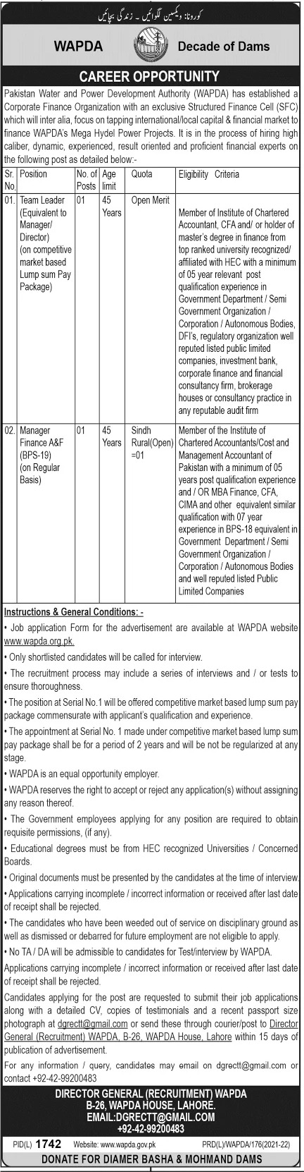 Vacancies in Water and Power Development Authority WAPDA Advertisement December 2021