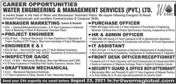 Water Engineering and Management Service Pvt Limited invites applications for Manager Marketing, Project Engineer, Engineer E&I, Inspector QC, Inspector QA, Draftsman Mechanical, Purchase Officer, HR and Admin Officer, IT Assistant, Front Desk Officer, IT Assistant, Security Guard in Lahore.
