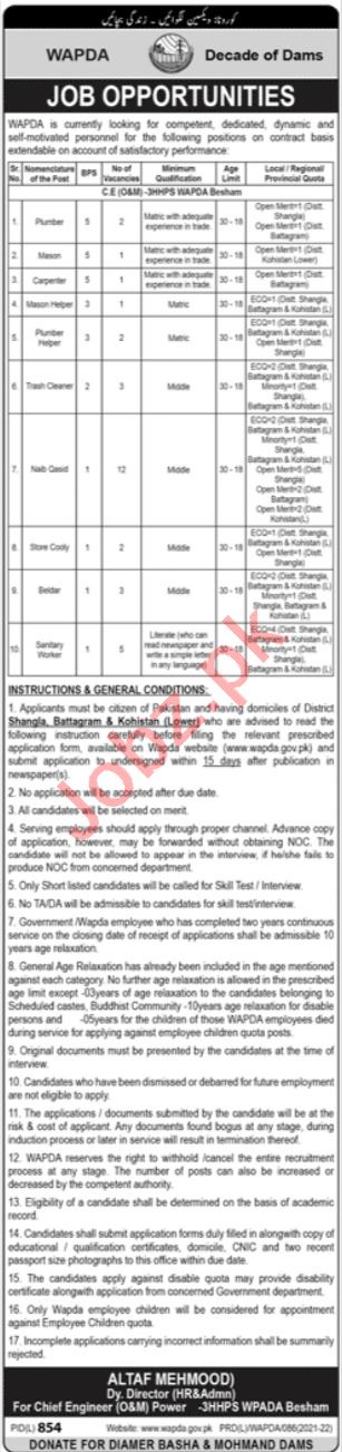 Latest Water and Power Development Authority WAPDA Management Posts Kohistan 2025