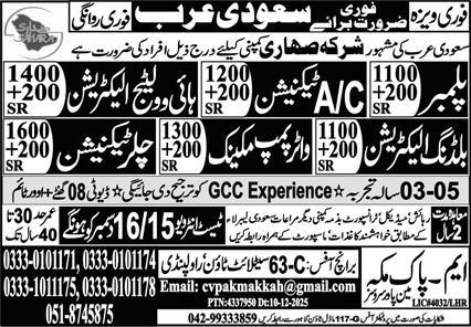 M Pak Makkah Manpower Services is looking for candidates for following posts as per job advertisement published in daily Express Newspaper of December 12, 2025 for location Riyadh, dammam Saudi Arabia: