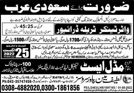 Latif Manpower Services is looking for candidates for following posts as per job advertisement published in daily Express Newspaper of August 23, 2022 for location Jeddah, makkah Saudi Arabia: