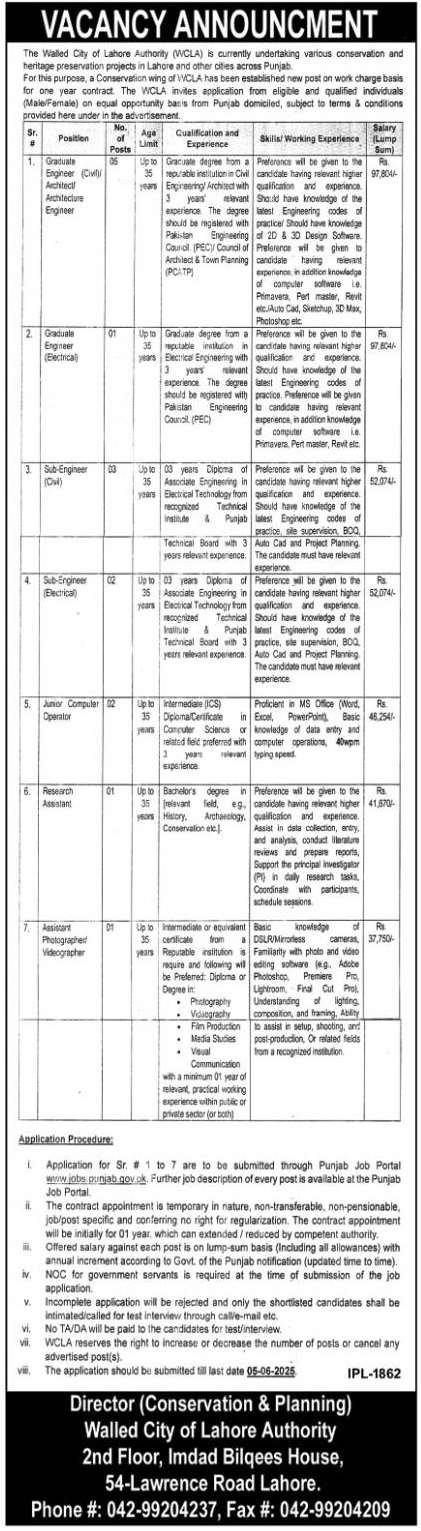 Vacant posts including civil engineer, sub engineer, sub engineer electrical, assistant photographer, sub engineer civil, videographer, architecture engineer, graduate engineer, computer operator, research assistant, architect and electrical engineer are announced in Walled City of Lahore Authority Lawrence Road Lahore, lahore Punjab Pakistan as per 17 May 2025 advertisement in daily Nation Newspaper. Educational qualifications required Others, Bachelor, DAE, Intermediate and B.E etc.