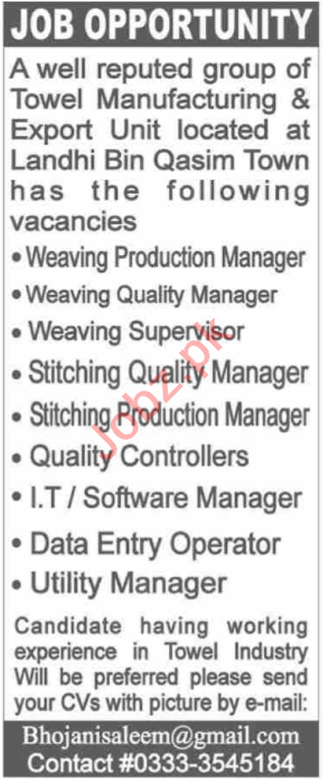 Vacancies in Towel Manufacturing Company Advertisement December 2020