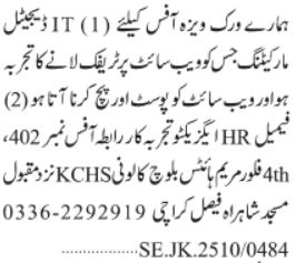 Vacant posts including hr executive and website developer are announced in Marketing Company Shahrah-e-Faisal Karachi, karachi Sindh Pakistan as per 31 October 2025 advertisement in daily Jang Newspaper. Preferred Education is Bachelor, BCS and BA etc.