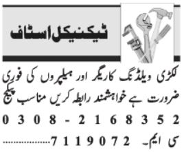 Manufacturing Company jobs advertisement dated about 18 June 2022 in daily Jang Newspaper invites application for the vacant post of welder, carpenter and helper in Lahore, lahore Punjab Pakistan. Candidates with Middle and Matric etc. educational background will be preferred.