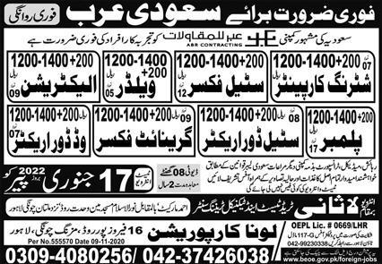 Luna Corporation jobs advertisement dated about 15 January 2022 in daily Express Newspaper invites application for the vacant post of granite fixer, shuttering carpenter, electrician, wood door erector, plumber, steel fixer and welder in Saudi Arabia Saudi Arabia. Candidates with Middle etc. educational background will be preferred.