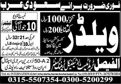 Vacant posts including welder are announced in Al Faisal Trade Test & Technical Training Center Dammam, tabuk Saudi Arabia as per 9 July 2024 advertisement in daily Express Newspaper. Educational qualifications required Matric and Middle etc.
