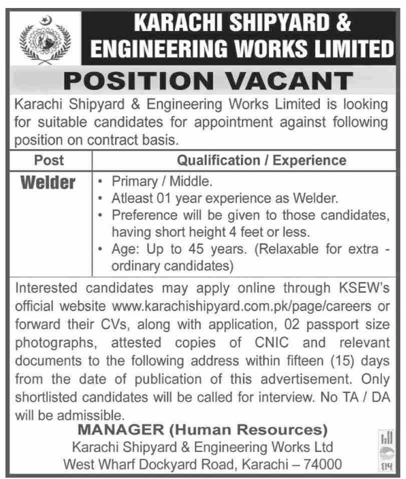 Vacant posts including welder are announced in Karachi Shipyard and Engineering Works Limited Karachi, karachi Sindh Pakistan as per 2 May 2022 advertisement in daily Dawn Newspaper. Preferred Education is Middle and Primary etc.