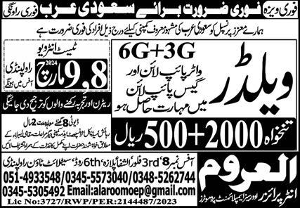 Vacant posts including welder are announced in Al Aroom Enterpirses Riyadh, riyadh Saudi Arabia as per 8 March 2024 advertisement in daily Express Newspaper. Candidates with Middle etc. educational background will be preferred.