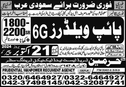 Prudential Manpower Recument Agency OEP jobs advertisement dated about 16 October 2024 in daily Express Newspaper invites application for the vacant post of welder, 6g welder and pipe welder in Jeddah, dammam Saudi Arabia. Persons with DAE, Matric and Intermediate etc. education can apply.