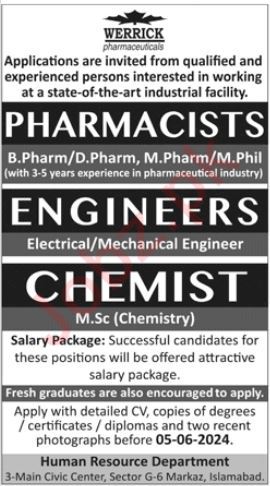 Werrick Pharmaceuticals jobs advertisement dated about 27 May 2024 in daily Jang Newspaper invites application for the vacant post of pharmacist, engineer and chemist in Islamabad, islamabad Islamabad Pakistan. Preferred Education is Bachelor, B Pharmacy, M.sc, Master and Pharma D etc.