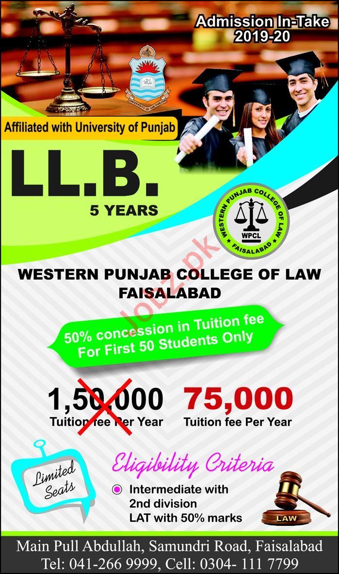 Western Punjab College Of Law affiliated from University of Punjab in Faisalabad is offering admissions for the class of LLB 05 years with have a tuition fee per year 75000. Read newspaper ad for exact details.