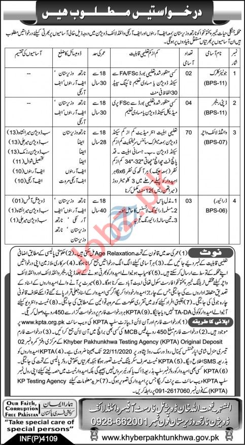 Wildlife Division North Waziristan, Forestry Environment and Wildlife Department, Government of the KPK is looking for the services from experienced candidates for the posts of Clerk, Junior Clerk, Deputy Ranger, Wildlife Searcher, Driver, LTV Driver, HTV Driver.