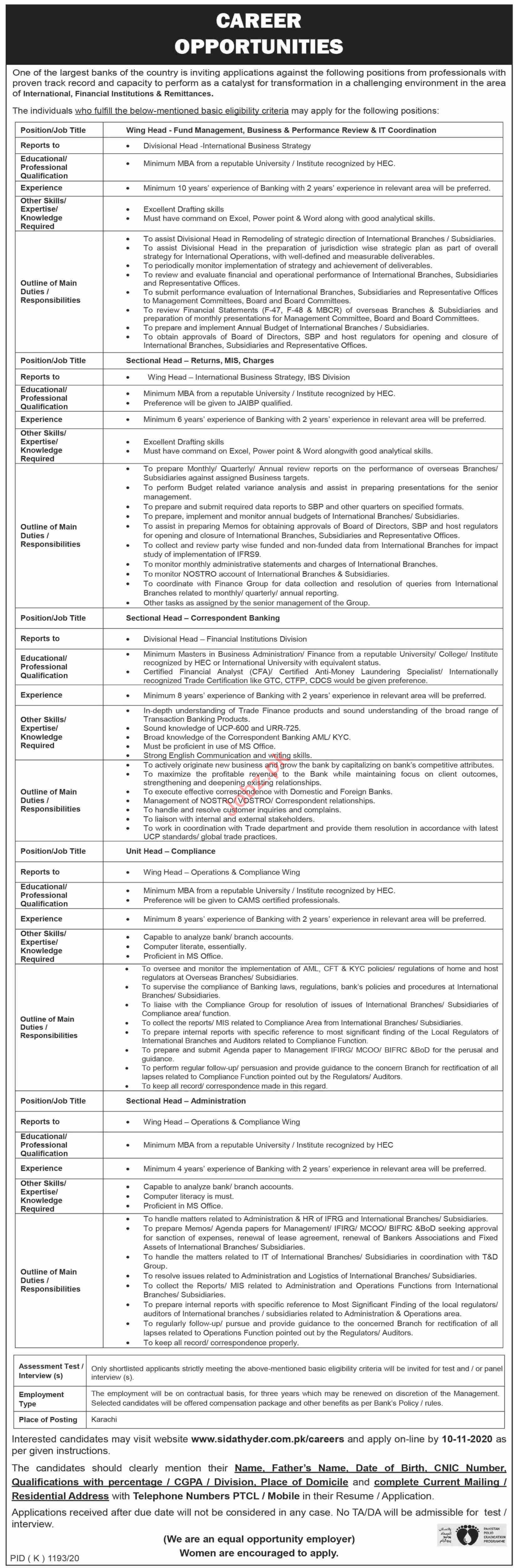 One of the largest banks of the country is seeking for the services from experienced candidates for the posts of Wing Head, Wing Head Fund Management, Wing Head Business, Wing Head Performance Review, Wing Head IT Coordination, Sectional Head, Sectional Head Returns, Sectional Head MIS, Sectional Head Charges, Sectional Head Correspondent Banking, Unit Head, Unit Head Compliance, Sectional Head Administration.