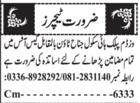 New Wisdom Public School invites applications for job positions advertised in daily Jang dated 5 February 2025 for following vacancies in Quetta, quetta Balochistan Pakistan.