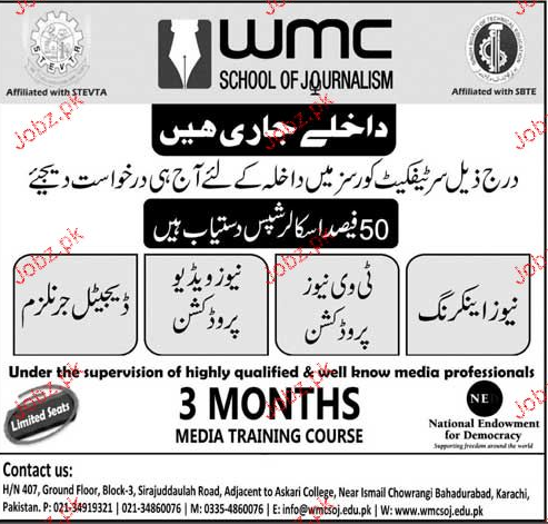 WMC School of Journalism Admission in Courses in News Anchor, TV News Production, and Digital Journalism in Karachi. Three Months Media Training Courses. Read newspaper ad for exact details.