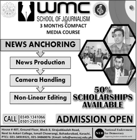 WMC School of Journalism has announced admissions for 3 Months Compact Media Courses in News Anchoring, News Production, Camera Handling & Non Linear Editing. Read newspaper ad for exact details.