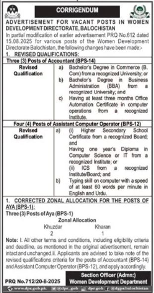 Women Development Department Quetta, quetta Balochistan Pakistan invites applications from eligible candidates for the post of assistant computer operator and accountant as per advertisement of August 21, 2025 published in daily Jang Newspaper. MS, Master and Bachelor etc. educational qualification will be preferred.