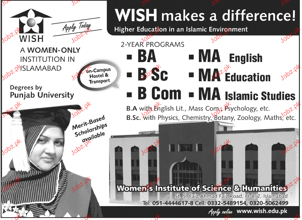 Women Institute of Science and Humanities Admission in BA, MA, Sc and bCom in Islamabad Read newspaper ad for exact details.