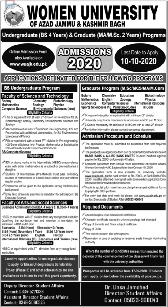 Women University of Azad Jammu & Kashmir invites applications for admissions in BS Undergraduate Program, BBA Hons, B-Com, MSc, MCS, MA, M-Com and Graduate Programs. Read newspaper ad for exact details.