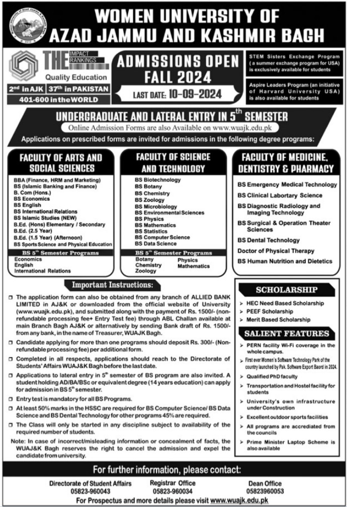 Admissions in Women University of Azad Jammu & Kashmir 2024 for Finance HRM and Marketing, Biotechnology, Emergency Medical Technology, Economics, Zoology, Surgical & Operation Theater Sciences has been announced. Eligible students can apply for academic admissions 2024 in Women University of Azad Jammu & Kashmir Bagh AJK Pakistan for Teaching University. Students for admissions in BS, B.ed, DPT, B.com and BBA can apply for online or campus classes as per Government institute criteria till admission closing date September 10, 2024. Read newspaper ad for exact details.