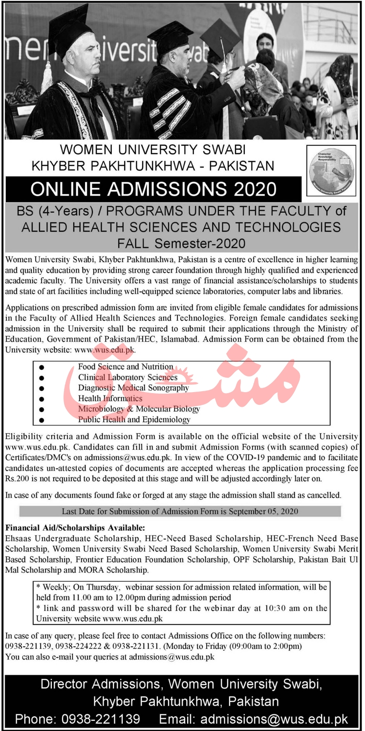 Women University Swabi Khyber Pakhtunkhwa has announced online admissions for 4 Years BS Programs in Food Science and Nutrition, Clinical Laboratory Sciences, Diagnostic Medical Sonography, Health Informatics, Microbiology & Molecular Biology, Public Health and Epidemiology. Read newspaper ad for exact details.