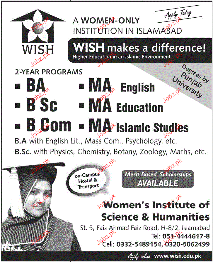 Women's Institute of Science and Humanities Admission in BA, BSc, MA and BCom in Islamabad Read newspaper ad for exact details.