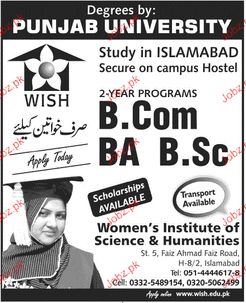 Women's Institute of Sciences & Humanities Admission in BCom, BSc and BA in Islamabad Read newspaper ad for exact details.