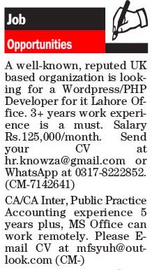 Private Company jobs advertisement dated about 1 February 2024 in daily The News Newspaper invites application for the vacant post of accounts manager, wordpress developer, accountant, auditor and php developer in Lahore, lahore Punjab Pakistan. Educational qualifications required CA, Bachelor and BCS etc.