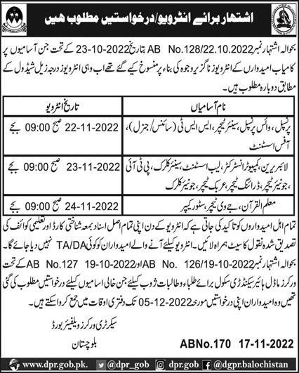 Workers Model Higher Secondary School, Workers Welfare Board Zhob, zhob Balochistan Pakistan invites applications from eligible candidates for the post of librarian, science teacher, arabic teacher, vice principal, lab assistant, office assistant, mulam al quran, clerk, pti, quran teacher, general teacher, store keeper, computer instructor, teacher, jv teacher, sst, drawing teacher and principal as per advertisement of November 18, 2022 published in daily Express Newspaper. Persons with Master, Intermediate, Matric and Bachelor etc. education can apply.