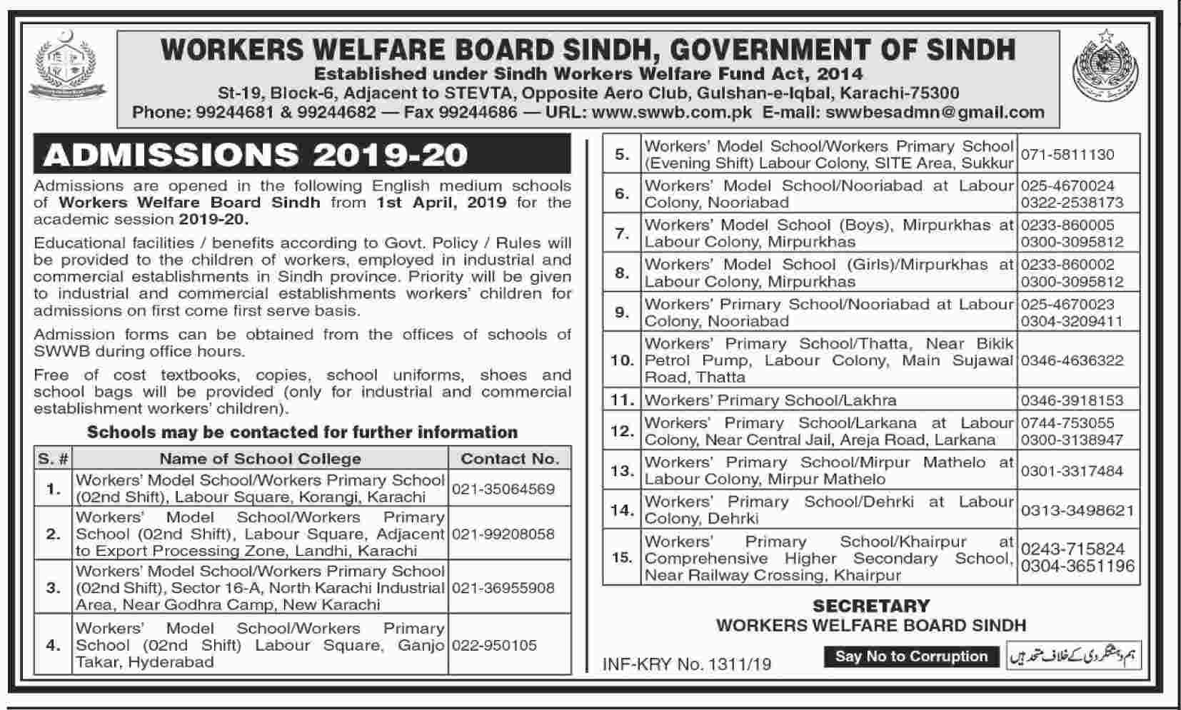 Workers Welfare School Karachi, Workers Welfare Board Sindh, Pakistan are started admissions spring 2019 for the classes of KG 1,Pre 9th and 10th Class. Last date of submission of application form 1st April 2019. Read newspaper ad for exact details.