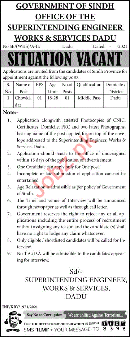 Works & Services Department Dadu Jobs 2021 For Chowkidar