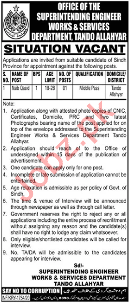 Works & Services Department Tando Allahyar Jobs Naib Qasid