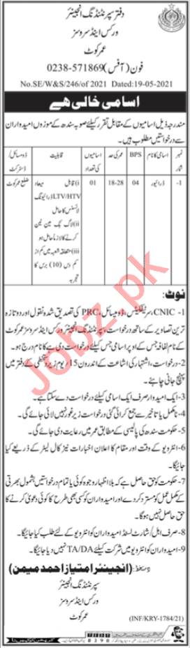 Works & Services Department Umerkot Jobs 2021 for Drivers