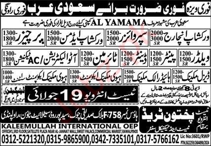 Kaleem Ullah International Overseas Employment Promoter jobs advertisement dated about 14 July 2024 in daily Express Newspaper invites application for the vacant post of workshop admin, hydraulic mechanic, tire man, heavy mechanic equipment assistant, auto electrician, painter, denter, heavy mechanic equipment, ac technician, purchaser, diesel mechanic, supervisor, workshop incharge and welder in Riyadh, riyadh Saudi Arabia. Middle, Intermediate and Matric etc. educational qualification will be preferred.
