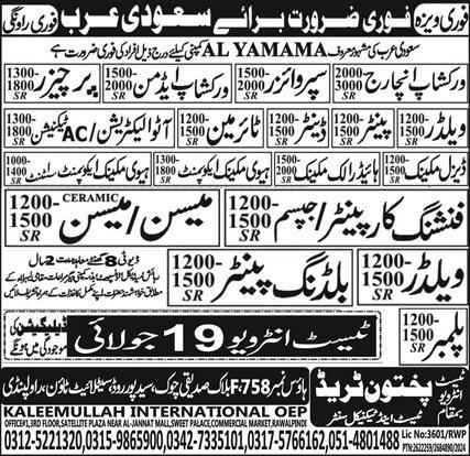 Kaleem Ullah International Overseas Employment Promoter Riyadh, riyadh Saudi Arabia invites applications from eligible candidates for the post of supervisor, diesel mechanic, auto electrician, painter, tire man, finishing carpenter, workshop incharge, denter, building painter, auto ac technician, purchaser, mason, welder and workshop admin as per advertisement of July 19, 2024 published in daily Express Newspaper. Matric, Middle and Intermediate etc. educational qualification will be preferred.