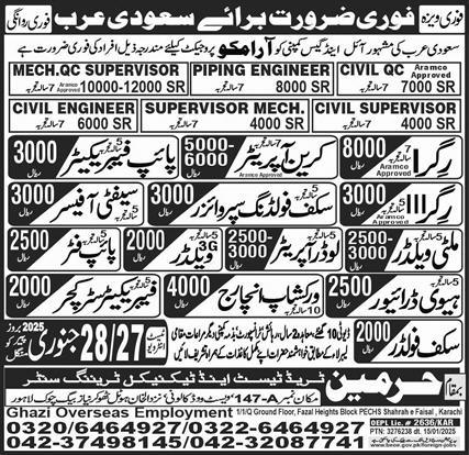 Harmain Trade Test & Technical Training Center jobs advertisement dated about 25 January 2025 in daily Express Newspaper invites application for the vacant post of supervisor mechanical, welder, civil engineer, safety officer, civil supervisor, civil qc, heavy driver, 3g welder, pipe fitter, crane operator, htv driver, driver, piping engineering, mechanical qc inspector, workshop incharge, loader operator, scaffolding supervisor, rigger, scaffolder, pipe fabricator, mulit welder and fabricator structure in Riyadh, jeddah Saudi Arabia. B.E, DAE, Matric, Intermediate and Bachelor etc. educational qualification will be preferred.