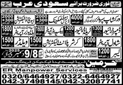 ER Manpower Services invites applications for job positions advertised in daily Express dated 7 December 2025 for following vacancies in Riyadh, riyadh Saudi Arabia.