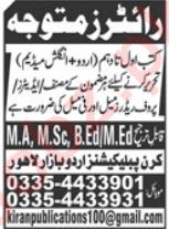 Kiran Publication invites applications for job positions advertised in daily Jang dated 11 September 2022 for following vacancies in Lahore, lahore Punjab Pakistan.