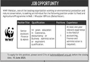 WWF Pakistan Khuzdar, khuzdar Balochistan Pakistan invites applications from eligible candidates for the post of assistant admin and assistant finance as per advertisement of June 5, 2025 published in daily Jang Newspaper. Candidates with Bachelor etc. educational background will be preferred.