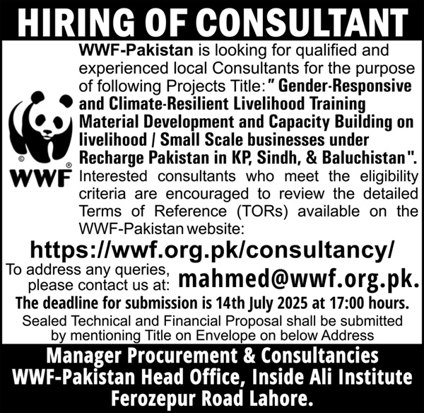 WWF Pakistan invites applications for job positions advertised in daily Nation dated 3 July 2025 for following vacancies in Ferozepur Road Lahore, lahore Punjab Pakistan.