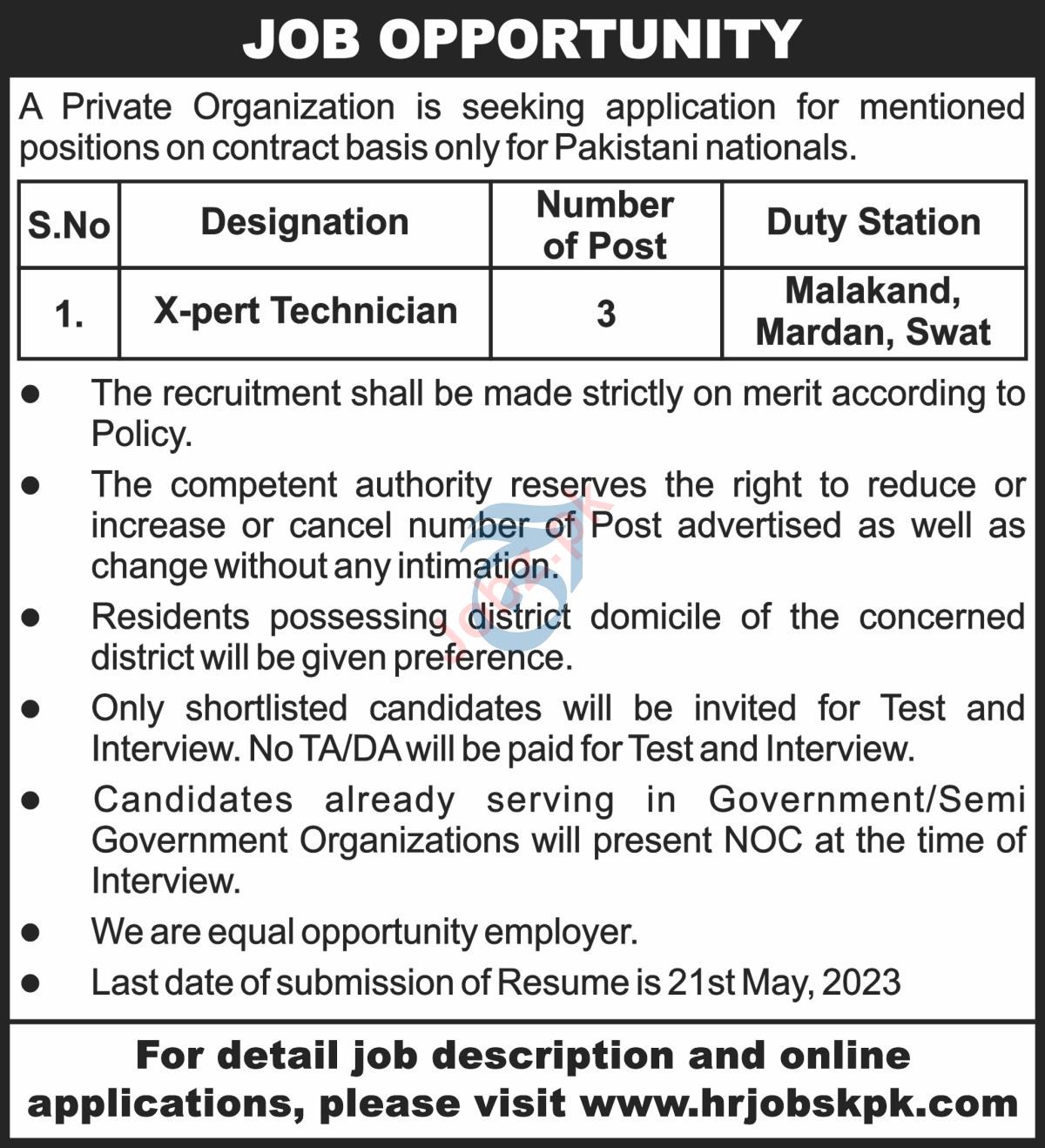 Vacant posts including xpert technician are announced in Private Organization Mardan, swat, malakand and mardan Khyber Pakhtunkhwa KPK Pakistan as per 7 May 2023 advertisement in daily Aaj Newspaper. Intermediate and Others etc. educational qualification will be preferred.