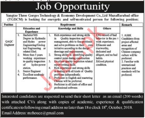Yangtze Three Gorges Technology AJK Engineers Jobs 2018
