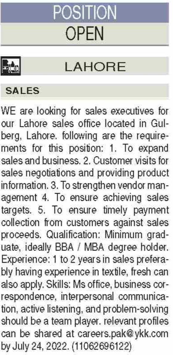 Vacant posts including sales executive are announced in YKK Pakistan Private Limited Lahore, lahore Punjab Pakistan as per 21 July 2022 advertisement in daily Dawn Newspaper. Persons with BBA and MBA etc. education can apply.