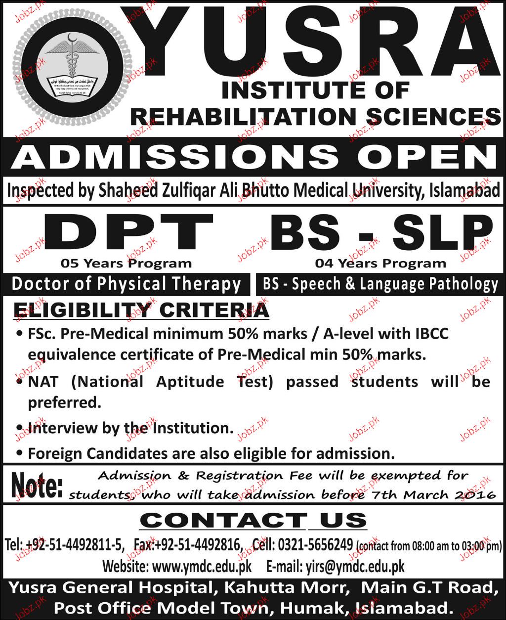 Yusra Institute of Rehabilitation Sciences Admission in BS-SLP and DPT in Islamabad. Read newspaper ad for exact details.